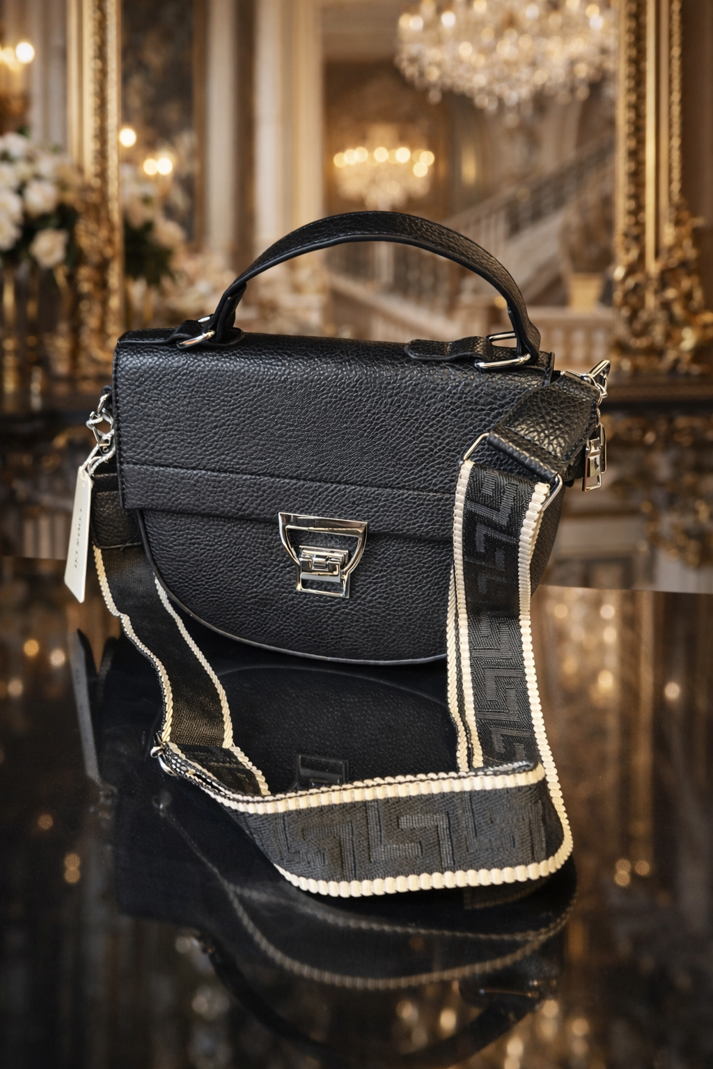 - Gestructureerd Design: Een compact, maar ruimtelijk ontwerp met een halvemaanvormige flap en een stevig bovenhandvat voor een chique uitstraling.
